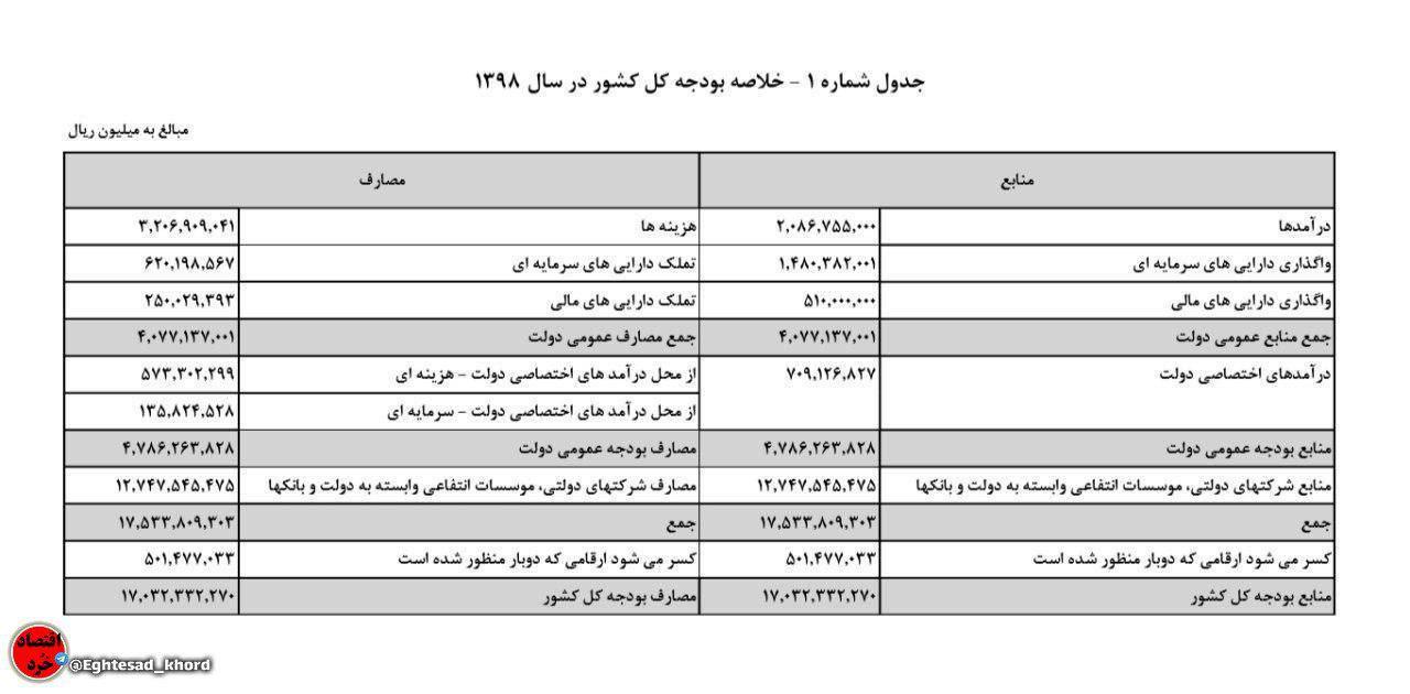 جدول خلاصه بودجه کل کشور در سال ۹۸ اعلام شد