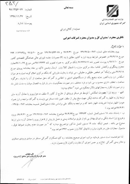 در این بخشنامه آمده است: پیرو بخشنامه هایی در خصوص شرایط ورود ارز به کشور مطابق با بند (۴) مصوبات جلسه شورای عالی هماهنگی اقتصادی کشور مورخ ۹۷.۰۷.۱۰، ضمن تاکید بر اینکه «هر شخص حقیقی و حقوقی می تواند با رعایت مقرراتی که بانک مرکزی اعلام کرده به هر میزان اسکناس ارز وارد کشور نماید و هیچ یک از دستگاه های امنیتی، انتظامی و گمرک حق ممانعت از آن را ندارد، هرگونه ممانعت تخلف اداری محسوب می شود و فرد متخلف در صورت محکومیت در بار اول به انفصال موقت به مدت ۶ ماه و در صورت تکرار به مجازات های بالاتر محکوم می شود.» اعلام می دارد: