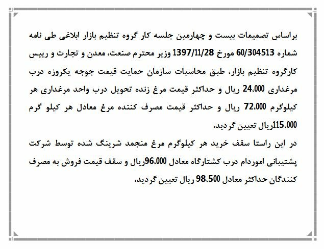 متن مصوبه ستاد تنظیم بازار در مورد قیمت گوشت مرغ به شرح زیر است: