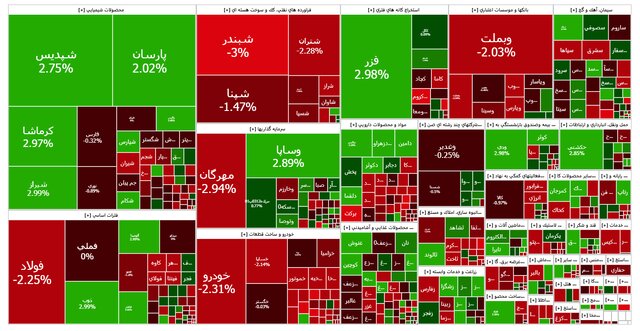 فملی، فارس و فولاد و فملی به ترتیب بیشترین تاثیر منفی را بر شاخص بورس داشتند. از نمادهای پرتراکنش نیز میتوان به خودرو، وبملت و مهرگان اشاره کرد.