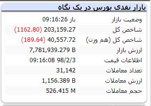 به گزارش تجارتنیوز، بازار سهام در ۱۵ دقیقه ابتدایی جریان معاملات امروز سوم اردیبهشت ماه سال ۱۳۹۸ با افت بیش از ۱۱۰۰ واحدی همراه شد و شاخص کل بورس به کانال ۲۰۳ هزار واحد بازگشت و در سطح ۲۰۳ هزار و ۱۵۹ واحد جای گرفت.