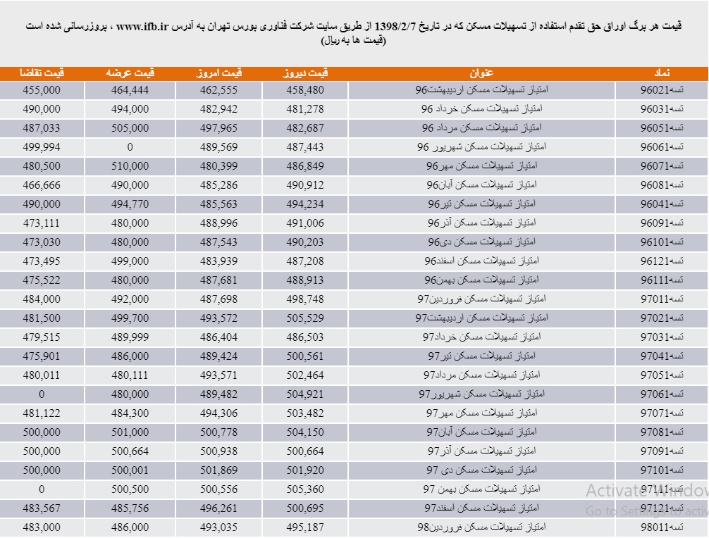 بورس تهران امروز شنبه ۷ اردیبهشت قیمت اوراق حق تقدم استفاده از تسهیلات مسکن (تسه) را به شرح جدول زیر به روز رسانی کرد.
