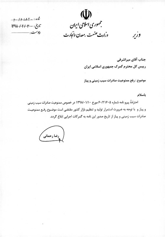 پیرو نامه شماره ۶۰/۲۱۶۰۵ به تاریخ ۱۰ فروردین ۹۸، در خصوص ممنوعیت صادرات سیبزمینی و پیاز و با توجه به ضرورت استمرار تولید و تنظیم بازار کشور مقتضی است موضوع رفع ممنوعیت صادرات سیبزمینی و پیاز را از تاریخ صدور این نامه به گمرکات اجرایی ابلاغ شود.