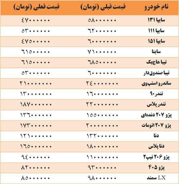 وی گفت: قیمت خودرو ۲۰۶ تیپ ۲ به ۹۴ میلیون تومان، پژو ۴۰۵ به ۸۲ میلیون تومان، سمند ۸۵ میلیون تومان رسیده است.