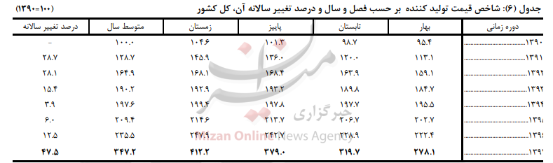 این در حالی است که متوسط شاخص قیمت تولید کننده در سال ۹۷ نسبت به سال ۹۰ رشد ۳۴۷.۲ داشته و درصد تغییر سالانه نیز به ۴۷.۵ درصد رسیده است.