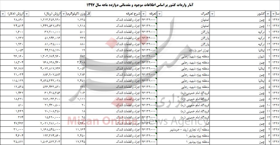 به گزارش میزان، آمار مقدماتی گمرک از تجارت خارجی ۱۲ ماهه سال ۹۷ نشان میدهد که در این مدت بیش از ۹۴ تن اجزا و قطعات فندک وارد ایران شده است.
