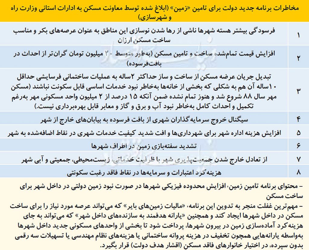 همه شهرهای کشور مطابق طرح‌های جامع شهری که پیش‌تر در شورای عالی شهرسازی و معماری کشور به تصویب رسیده دارای خط محدوده مشخص هستند که این ابعاد فیزیکی شهر براساس دست‌کم ۴ پارامتر کلیدی همچون «تغییرات آتی جمعیت ساکن شهر، ظرفیت زیست‌محیطی، امکانات و خدمات شهری قابل دسترس و منابع آبی»، از قبل تعیین شده است. بدیهی است صرفا با هدف «ساخت مسکن» نمی‌توان از این پارامترها گذر کرد آن هم در شرایطی که یک بار در بخشی از طرح مسکن مهر- سکانس تلخ- ثابت شد خانه‌سازی در نقاطی که خدمات ندارد از یکسو قیمت تمام شده ساخت مسکن را افزایش می‌دهد و از سوی دیگر ضمن طولانی شدن فرآیند ساخت از ۲ سال به حداقل ۱۰ سال، ساختمان‌هایی را پدید می‌آورد که تا سال‌ها کمترین رغبت به سکونت در آنها در بین حتی فاقدان مسکن وجود ندارد. این تجربه قرار است دوباره تکرار شود با این تفاوت که امکانات و منابع محدود دولت هنوز برای تامین خدمات زیربنایی و روبنایی طرح مسکن مهر، درگیر و ناکافی است.