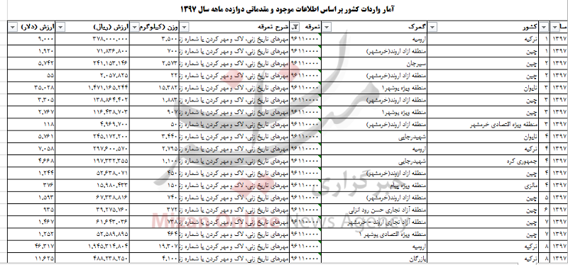 گفتنی است این میزان مهرهای تاریخ زنی، لاک و مهر کردن یا شمارهزنی از کشورهای تایوان، ترکیه، جمهوری کره، چین و مالزی وارد کشور شده است.