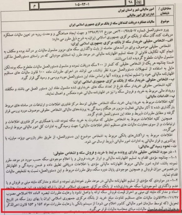در مواردی که مودی از تسلیم اظهارنامه مالیاتی در موعد مقرر خودداری نموده و اسناد و مدارک مثبته مبنی بر فروش و یا عدم واگذاری سکه خریداری شده از بانک مرکزی جمهوری اسلامی را ارائه ننماید، در این صورت چنانچه اسناد و مدارک مثبتهای مبنی بر احراز قیمت فروش سکه ارائه یا واصل نشود با رعایت مقررات، تفاوت مبلغ خرید از بانک مرکزی با بهای روز سکه در تاریخ تحویل از سیستم بانکی مبنای محاسبه مالیات قرار میگیرد.