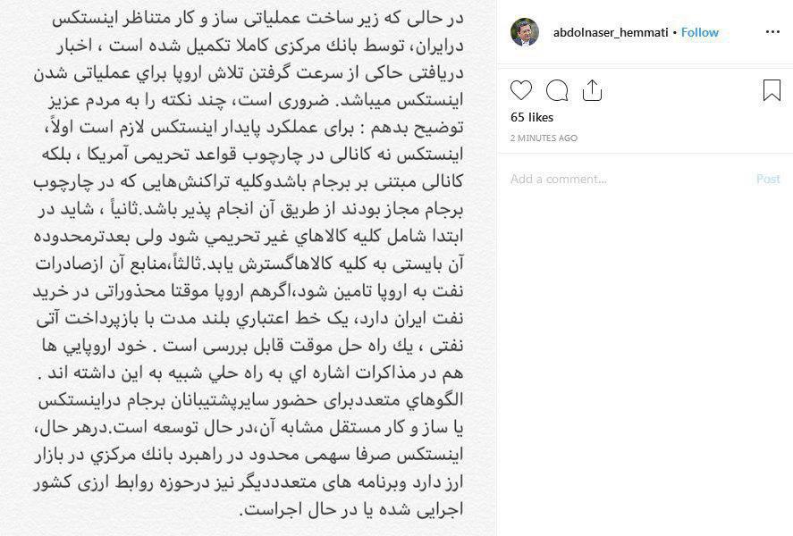 به گزارش الف، عبدالناصر همتی در یادداشتی اینستاگرامی نوشت: در حالی که زیر ساخت عملیاتی سازوکار متناظر اینستکس در ایران، توسط بانک مرکزی کاملا تکمیل شده است ، اخبار دریافتی حاکی از سرعت گرفتن تلاش اروپا برای عملیاتی شدن اینستکس میباشد.