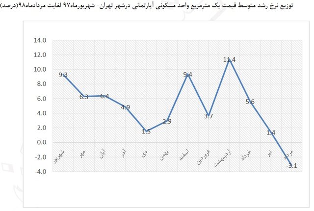 با وجودی که در اردیبهشت ماه ۱۳۹۸ همانند شهریور و اسفندماه ۱۳۹۷ شاهد شوک شدید ماهیانه در بازار مسکن بودیم بر اساس اطلاعات دفتر اقتصاد مسکن در مردادماه ۱۳۹۸ برای اولین بار دست کم از زمان آغاز افزایش قیمتها در ابتدای سال ۱۳۹۶ تا کنون به منفی ۳.۱ درصد رسید. در مردادماه ۱۳۹۸ میانگین قیمت مسکن شهر تهران به ۱۳ میلیون و ۱۹۰ هزار تومان در هر متر مربع رسید که نسبت به ماه قبل ۳.۱ درصد کاهش و نسبت به ماه مشابه سال قبل ۷۷.۵ درصد افزایش را نشان میدهد.