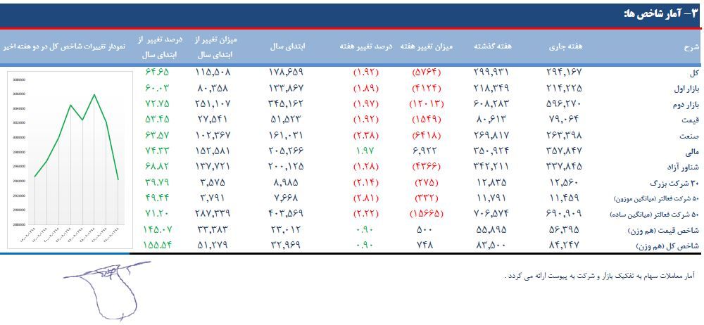 اطلاعات منتشر شده از داد و ستدهای تالار شیشه ای حاکی از آن است که در پایان معاملات هفته منتهی به ۲۷ شهریورماه ۹۸، شاخص کل با (۵.۷۶۴) واحد کاهش معادل (۱.۹۲) درصد به ۲۹۴.۱۶۷ واحد رسید. بر اساس این گزارش، شاخص کل هم وزن با ۷۴۸ واحد افزایش معادل ۰.۹۰ درصد به رقم ۸۴.۲۴۷ واحد را به نمایش گذاشت.