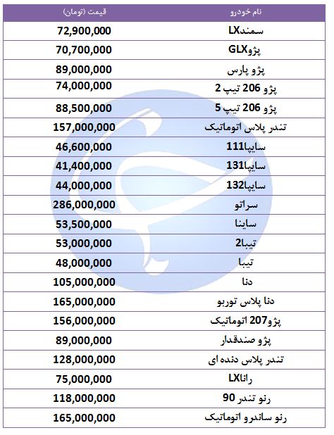 پژو ۲۰۶ تیپ ۲ (ساده) ۷۴ میلیون تومان، سایپا ۱۳۱ معادل ۴۱ میلیون و ۴۰۰ هزار تومان، سایپا ۱۳۲ معادل ۴۴ میلیون تومان، ساینا ۵۳ میلیون و ۵۰۰ هزار تومان، تیبا ۲ معادل ۵۳ میلیون تومان، تیبا ۴۸ میلیون تومان، دنا پلاس توربو ۱۶۵ میلیون تومان، پژو ۲۰۷ اتوماتیک ۱۵۶ میلیون تومان، پژو صندقدار ۸۹ میلیون تومان، تندر پلاس دندهای ۱۲۸ میلیون تومان، رانا ال ایکس ۷۵ میلیون تومان، رنو تندر ۹۰ معادل ۱۱۸ میلیون تومان و رنو ساندرو اتوماتیک ۱۶۵ میلیون تومان بدون تغییر در قیمت نسبت به دیروز معامله شدند.