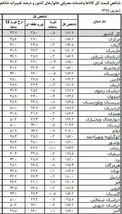 گزارش مرکز آمار ایران حاکی است، در شهریورماه سال جاری، نرخ تورم در استانهای ایلام ۵۱.۹ درصد، کردستان ۵۱.۱ درصد، چهارمحال و بختیاری و خراسان جنوبی ۵۰.۳ درصد و لرستان و خراسان شمالی ۵۰ درصد شده است.