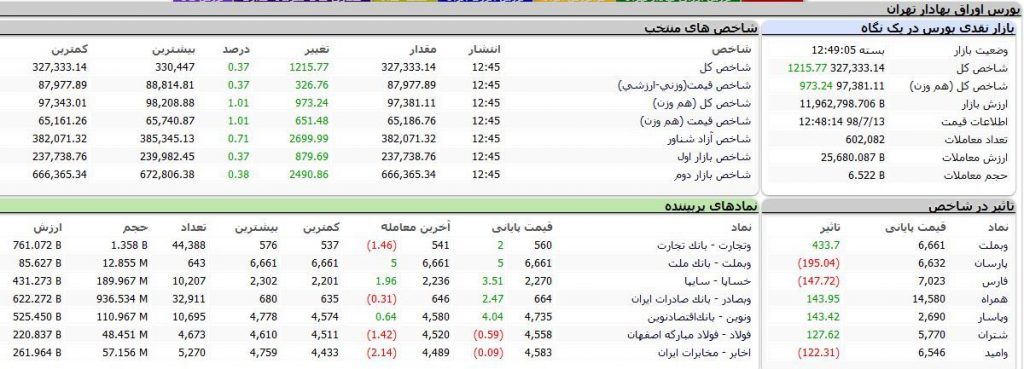 بر اساس آمارهای معاملاتی، روز جاری اکثر شاخصهای بورس با رشد مواجه شدند به طوری که شاخص کل با ۱۲۱۵ واحد رشد معادل ۰.۳۷ درصد به ۳۲۷ هزار و ۳۳۳ واحد، شاخص قیمت «وزنی – ارزشی» با ۳۲۶ واحد افزایش معادل ۰.۳۷ درصد به ۸۷ هزار و ۹۷۷ واحد، شاخص کل «هم وزن» با ۹۷۳ واحد رشد معادل ۱.۰۱ درصد به ۹۷ هزار و ۳۸۱ واحد، شاخص قیمت «هم وزن» با ۶۵۱ واحد افزایش، معادل ۱.۰۱ درصد به ۶۵ هزار و ۱۸۶ واحد، شاخص آزاد شناور با ۲۶۹۹ واحد رشد، معادل ۰.۷۱ درصد به ۳۸۲ هزار و ۷۱ واحد، شاخص بازار اول با ۸۷۹ واحد افزایش معادل ۰.۳۷ درصد به ۲۳۷ هزار ۷۳۸ واحد و شاخص بازار دوم با ۲۴۹۰ واحد رشد معادل ۰.۳۸ درصد، به ۶۶۶ هزار و ۳۶۵ واحد رسید.