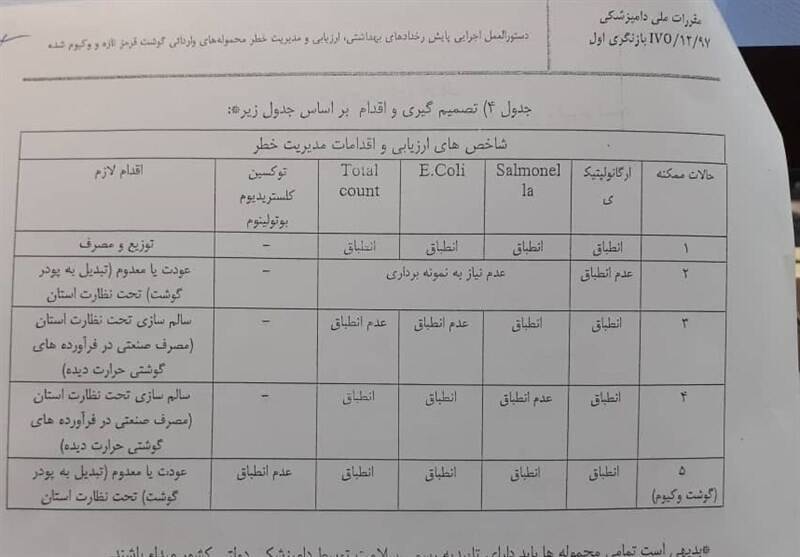 در ادامه این نامه نگاری ها، علی صفر ماکنعلی معاون بهداشتی و پیشگیری سازمان دامپزشکی نیز با ارسال نامه ای به مسعود محمدیان مدیر کل دفتر قرنطینه و امنیت زیستی با موضوع « اصلاح فرآیند نظارت بهداشتی بر محمولههای گوشت قرمز وارداتی» نوشت: « پیرو نامه شماره ۰۲۰/۲۲۴۴۷ مورخ ۱۳۹۷/۱۱/۱۵ مقام عالی وزارت با توجه به لزوم تغییر در فرآیند تولید گوشت قرمز وارداتی موارد ذیل جهت استحضار و ابلاغ به کارشناسان به حضور ایفاد میگردد: