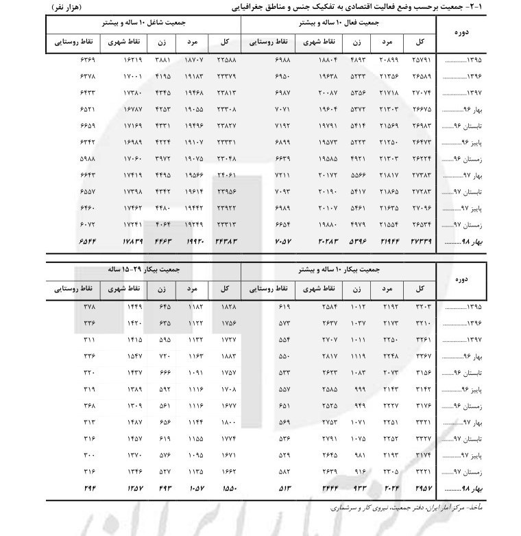 به گزارش تسنیم، مطابق آخرین آمار منتشر شده از مرکز آمار در گزارش فصلی اقتصاد ایران در بهار ۹۸ ،بر اساس نتایج طرح آمارگیری نیروی کار مرکز آمار ایران در فصل بهار ۹۸ جمعیت فعال ۱۰ ساله و بیشتر ۲۷۳۳۹هزار نفر بوده است که از این تعداد ۲۴۳۸۳ هزار نفر یعنی بیش از ۸۹ درصد آن را شاغلان و ۲ هزار و ۹۵۷ هزار نفر یعنی حدود ۱۱درصد را بیکاران تشکیل میدهد. از کل تعداد بیکاران کشور هزار و ۵۵۰ هزار نفر یعنی بیش از ۵۲ درصد را جوانان ۱۵ تا ۲۹ سال تشکیل میدهند.