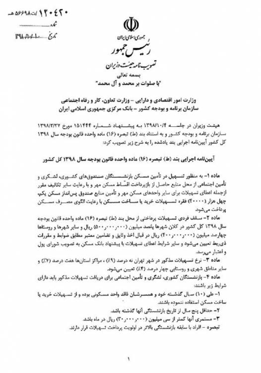 براساس مصوبه هیات وزیران آیین نامه وام مسکن بازنشستگان اعلام شد که بر اساس آن ۵۰ میلیون تومان به بازنشستگان کلانشهرها و ۴۰ میلیون تومان به ساکنان سایر شهرها اعطا میشود.
