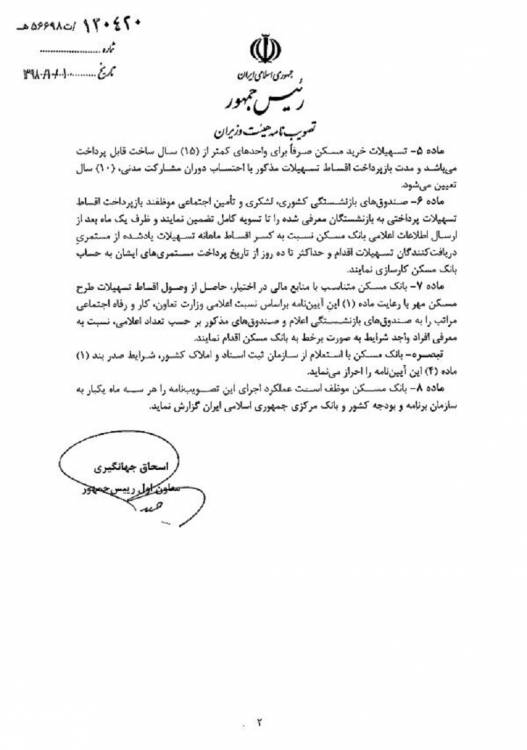 اسحاق جهانگیری تصویب نامه هیات وزیران در خصوص آییننامه اعطای تسهیلات خرید مسکن به بازنشستگان با عاملیت بانک مسکن را به رؤسای بانک مرکزی و سازمان برنامه و بودجه و وزرای تعاون، کار و رفاه اجتماعی و امور اقتصادی و دارایی ابلاغ کرد.