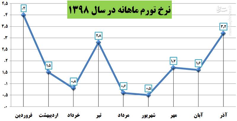 در حالی که از اواسط امسال، نرخ تورم ماهانه رو به کاهش گذاشته بود در آذرماه به شدت افزایش یافته است. منظور از نرخ تورم ماهانه، درصد تغییر عدد شاخص قیمت، نسبت به ماه قبل میباشد. نرخ تورم ماهانه آذر ١٣٩٨ به ٣,٢ درصد رسیده که در مقایسه با ماه قبل، ۲ برابر شده است.
