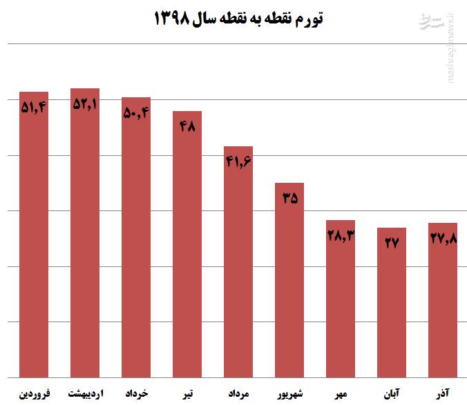 تورم نقطه به نقطه هم که از اردیبهشتماه نزولی شده بود، از آذرماه دوباره صعودی شد. منظور از نرخ تورم نقطهای، درصد تغییر عدد شاخص قیمت، نسبت به ماه مشابه سال قبل میباشد.