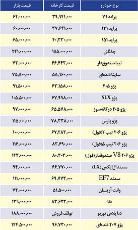 علاوه بر این، قیمت پژو ۲۰۶ تیپ ۲ در کارخانه ۶۷ میلیون و ۲۸۳ هزار تومان است اما با اختلاف ۳۳ میلیون تومانی در بازار ۱۰۰ میلیون تومان، پراید ۱۱۱ در کارخانه ۳۹ میلیون و ۹۰۰ هزار تومان اما در بازار با اختلاف ۲۴ میلیون تومانی ۶۴ میلیون تومان و دنا در کارخانه ۸۳ میلیون و ۶۲۳ هزار تومان اما در بازار با اختلاف ۵۵ میلیون تومانی ۱۳۹ میلیون تومان معامله میشوند. در بازار دیروز خرید و فروش خودرو، پراید ۱۱۱ با رشد ۷ میلیون تومانی نسبت به ۲ هفته اخیر به ۶۴ میلیون تومان، تیبا از ۶۱ میلیون تومان به ۷۳ میلیون تومان، پژو ۲۰۶ تیپ ۲ از ۹۶ میلیون تومان به ۱۰۰ میلیون تومان و پژو ۲۰۶ صندوقدار از ۱۱۴ میلیون تومان به ۱۲۳ میلیون تومان رسید.