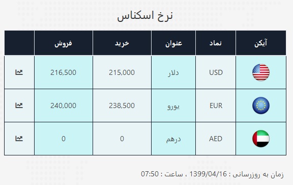 قیمت خرید و فروش دلار به ترتیب ۲۱۵۰۰ و ۲۱۶۵۰ تومان است. نرخ خرید یورو ۲۳۰۰۰ و قیمت فروش ۲۳۳۰۰ تومان است.