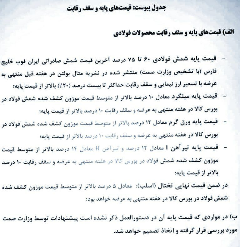 براساس تصویری که از این تصمیم احتمالی در شبکههای اجتماعی دست به دست میشود، قیمت پایه ارزان برای شمش فولاد بعضاً تا ۶۰ درصد قیمت جهانی تعیین شده است و سقف قیمت برای معاملات در بورس کالا نیز محدود خواهد شد.