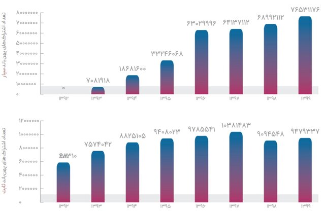 تعداد اشتراکهای پهنباند ثابت نیز از ۵۸ هزار و ۳۱۰ اشتراک در سال ۹۲ به ۹ میلیون و ۴۷۹ هزار و ۳۳۷ اشتراک در سال جاری و در حوزه پهنباند سیار از اشتراک صفر در سال ۱۳۹۲ به ۷۶ میلیون و ۵۳۱ هزار و ۱۷۶ اشتراک در سال ۱۳۹۹ رسیده است.