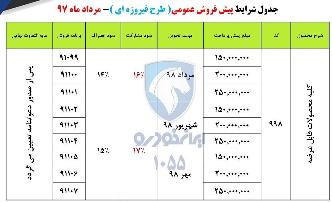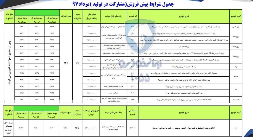 در این طرح فروش محصولاتی از جمله پژوپارس، پژو۲۰۶ تیپ ۲ و تیپ ۵، پژو۲۰۷ دستی ، H30، سورن ، دنا و هایما S7 با تحویل خرداد، تیر و مرداد ماه ۹۸ پیش بینی شده است.
