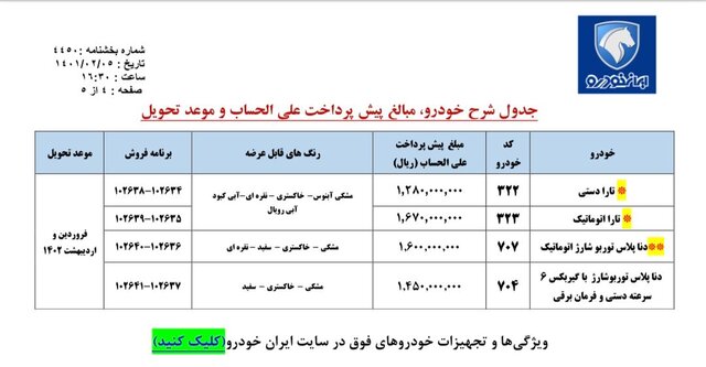 موعد تحویل این خودروها، فروردین و اردیبهشت ماه ۱۴۰۲ و مطابق قیمت زمان تحویل مندرج در قرارداد منتخبان، در نظر گرفته شده است.