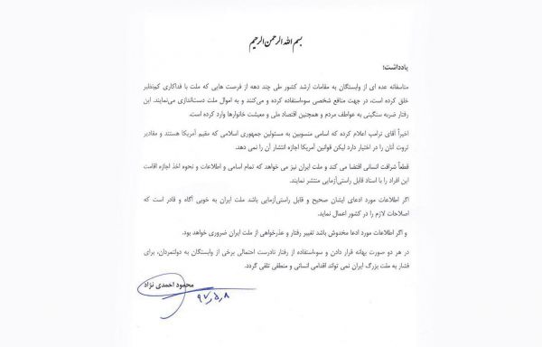 رئیس جمهور پیشین ایران در یادداشتی که در اختیار خبر فوری قرار داده، نسبت به توییت خود خطاب به رییس جمهور آمریکا توضیحاتی را ارائه داد.