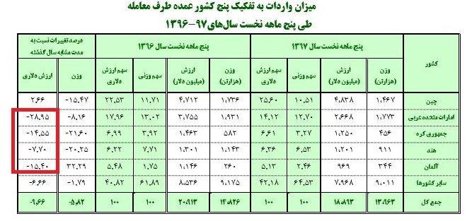 بررسی آمارهای تجارت خارجی کشور نشان میدهد، در ۵ماهه نخست سال جاری میزان واردات از ۴شریک اصلی تجاری ایران کاهش یافته است.