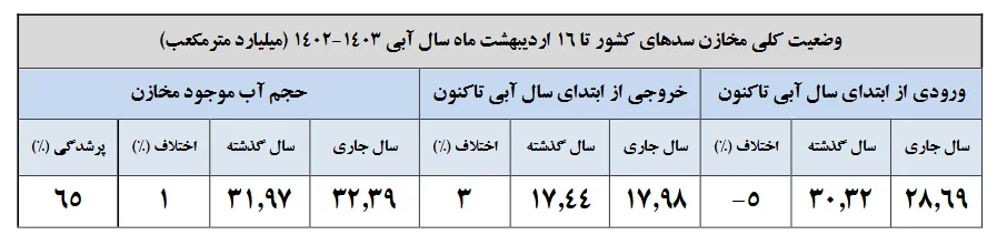 حجم آب موجود مخازن اکنون ۳۲.۳۹ میلیارد متر مکعب ثبت شده که این عدد نسبت به سال قبل که عددی معادل ۳۱.۹۷ میلیارد متر مکعب بوده یک درصد افزایش داشته است. همچنین حجم پرشدگی سدهای کشور نیز تا این تاریخ ۶۵ درصد است.
