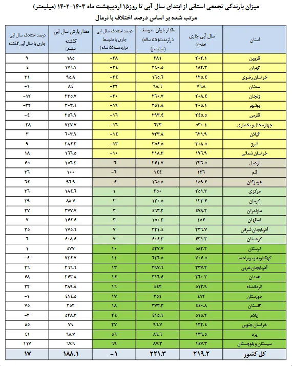 همچنین ارتفاع کل ریزشهای جوی کشور معادل ۲۱۹.۲ میلیمتر است. این مقدار بارندگی نسبت به میانگین دورههای مشابه درازمدت (۲۲۱.۳میلیمتر) ۱ درصد کاهش و نسبت به دوره مشابه سال آبی گذشته (۱۸۸.۱میلیمتر) ۱۷ درصد کاهش را نشان میدهد.