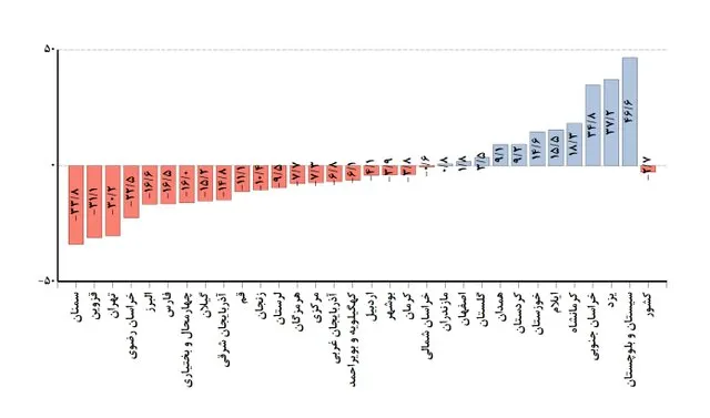 بر اساس نمودار پایین، میزان تامین بارندگیها از ابتدای سال آبی جاری تاکنون نسبت به میانگین بلندمدت در استانهای سمنان، قزوین، تهران، خراسان رضوی، البرز، فارس، چهارمحال و بختیاری، گیلان، آذربایجان شرقی، قم، زنجان، لرستان، هرمزگان، مرکزی، آذربایجان غربی، کهگیلویه و بویراحمد، اردبیل، بوشهر، کرمان و خراسان شمالی کاهشی و میزان تامین بارندگیها در مازندران، اصفهان، گلستان، همدان، کردستان، خوزستان، ایلام، کرمانشاه، خراسان جنوبی، یزد و سیستان و بلوچستان افزایشی بوده است.