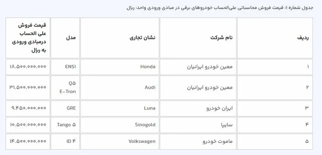 از این هفت خودروی برقی عرضه شده شامل هونگچی EQM۵، کیامسی EJ۷، آئودی Q۵، هوندا ENS۱، فولکس واگن ID۴، لونا GRE و سیناگولد Tango ۵ عرضه شده که از این محصولات دو محصول دارای قیمت قطعی در مبادی ورودی و پنج محصول دارای قیمت علیالحساب در مبادی ورودی هستند.