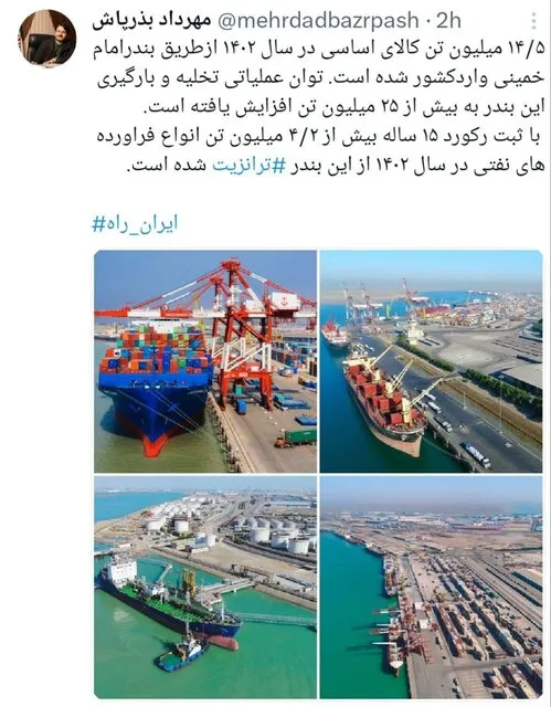 بنابر اعلام وزیر راه وشهرسازی، با ثبت رکورد ۱۵ ساله بیش از ۴.۲ میلیون تن انواع فرآورده‌های نفتی در سال ۱۴۰۲ از بندر امام خمینی ترانزیت شده است.